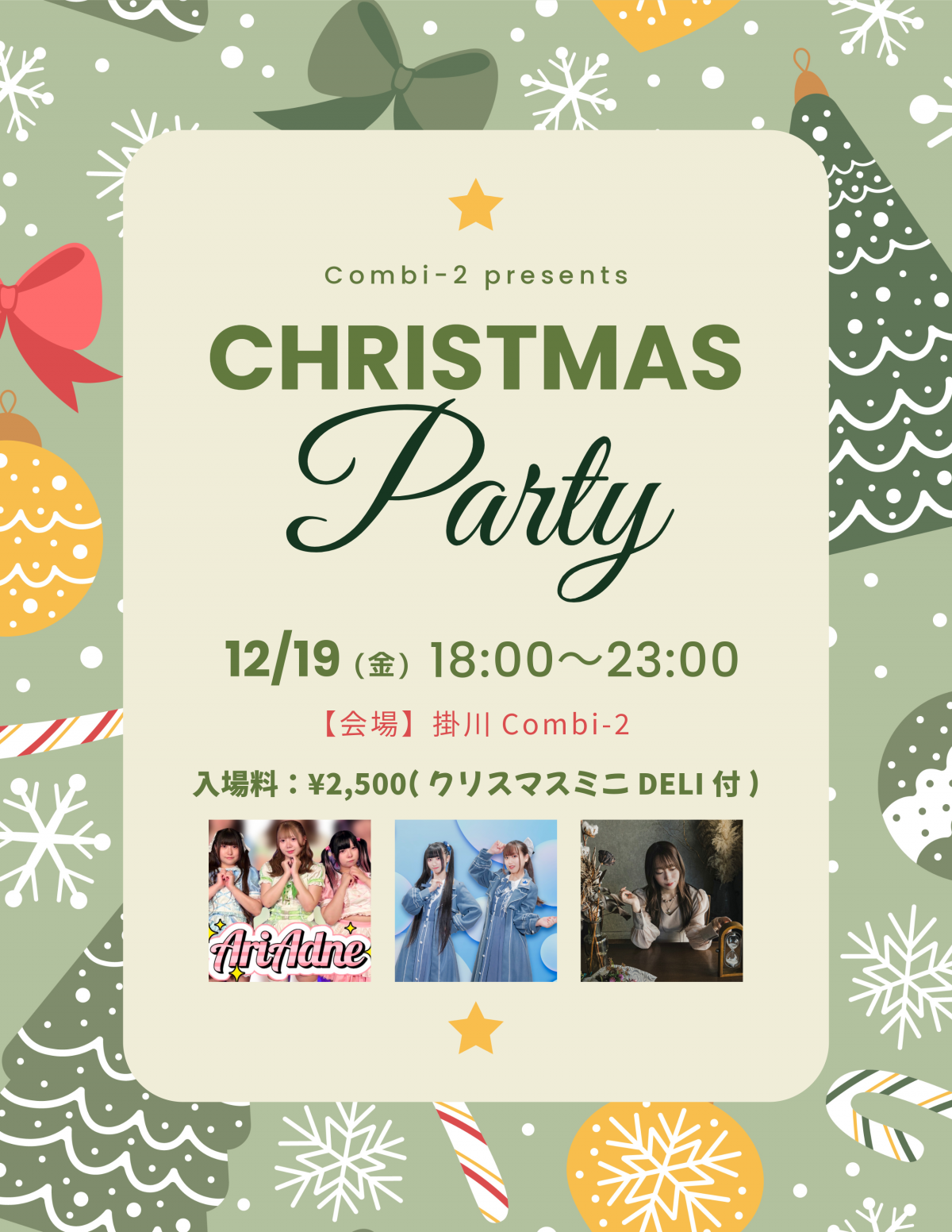 12/19(金) Christmas Party📍掛川Combi-2《時間》18:00〜23:00🎤21:00頃からミニライブあり!チケット:¥2,500(クリスマスミニDELI付)《出演》AriAdone/Marble-Maple/望月瑠奈